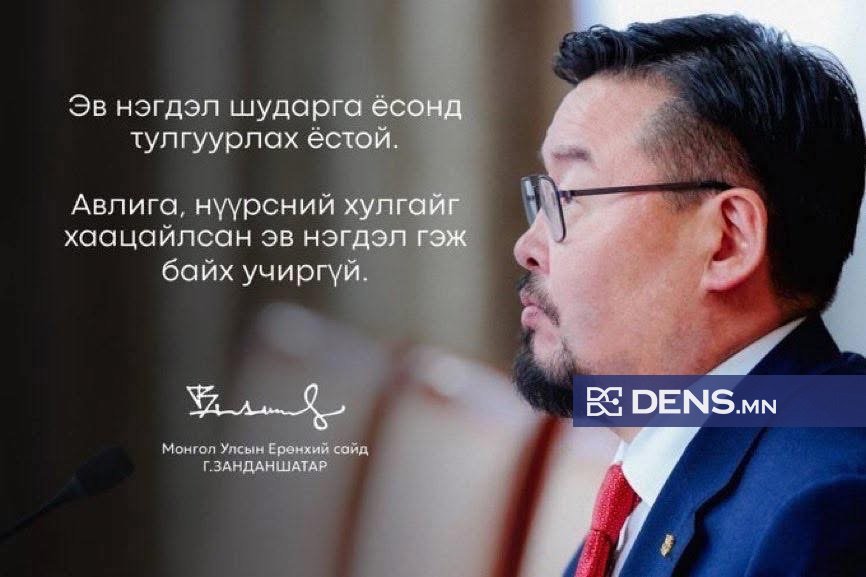 Монгол улсад ХУЛГАЙ ДЭЭРЭМ ЗАСАГЛАХ УУ, ХУУЛЬ ЁС ЗАСАГЛАХ УУ? гэдэг салаа замын уулзвар дээр Та бид ирээд байна. Хулгай ялах уу, хууль ёс ялах уу гэдэг хурууны хээтэй, төрийн тамгатай түүхэн сонголтын өмнө зогсож байна.